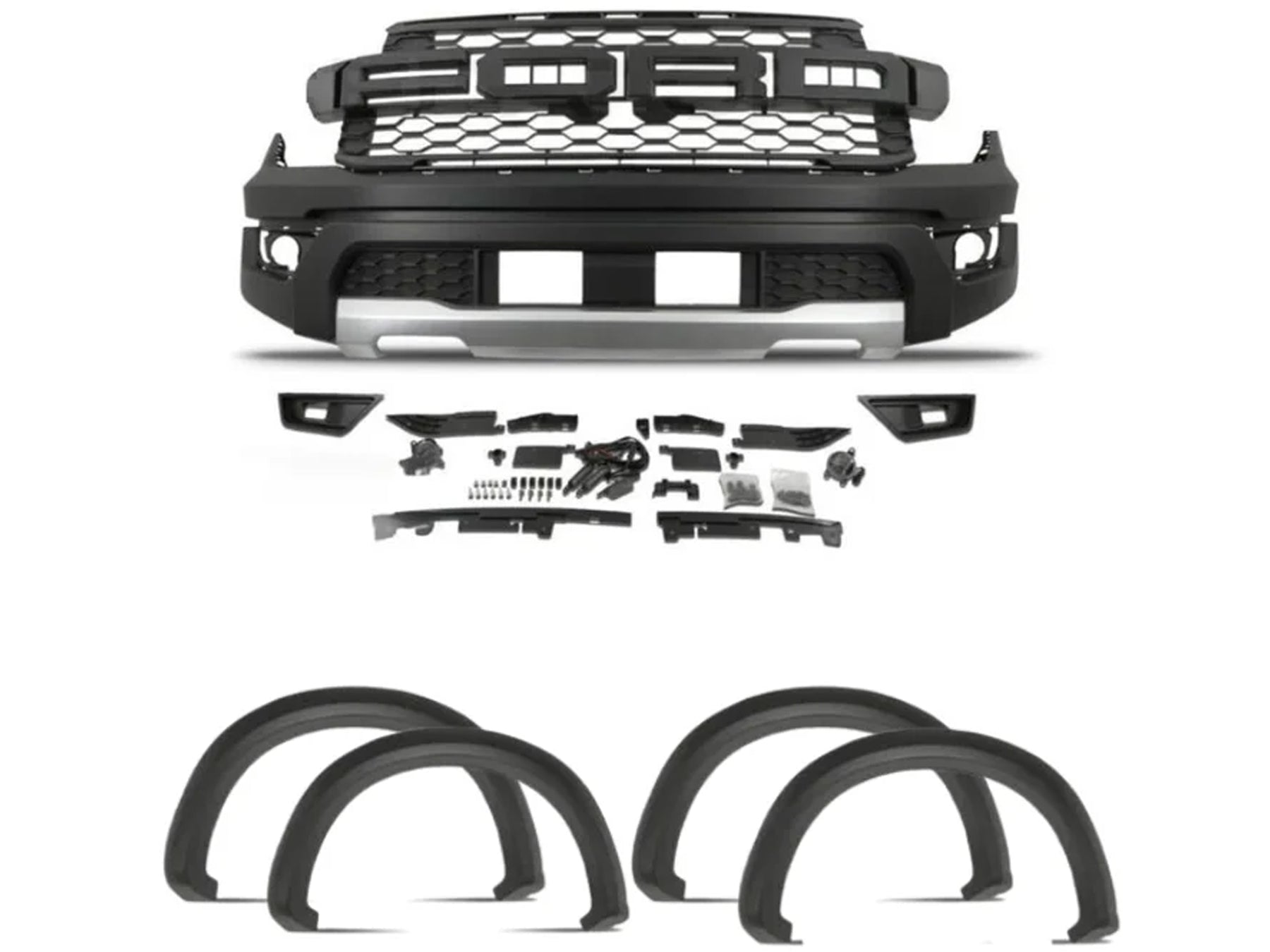 Body kit completo para Ford Ranger a Raptor con extensores de guardabarros negros, compatible con todos los modelos de 2024 - 2026. El bomper, la persiana y los ampliaciones están fabricados en ABS de alta calidad, el material más adecuado para estos accesorios, ya que garantiza una alta resistencia combinada con un excelente acabado, con el mismo patrón que el accesorio Raptor original, dale una apariencia mas agresiva a tu Ranger.
